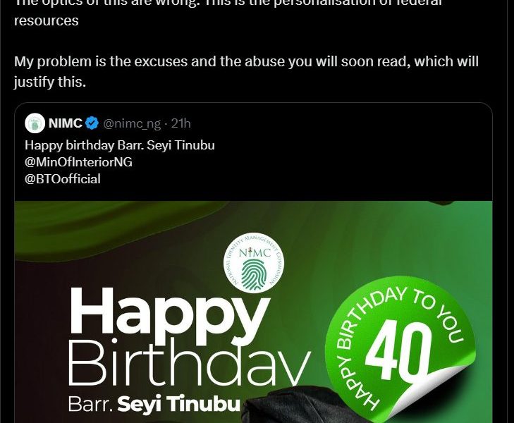 The National Identity Management Commission (NIMC) has deleted a birthday message it posted to Seyi Tinubu, son of President Bola Tinubu, following widespread backlash from Nigerians on social media.