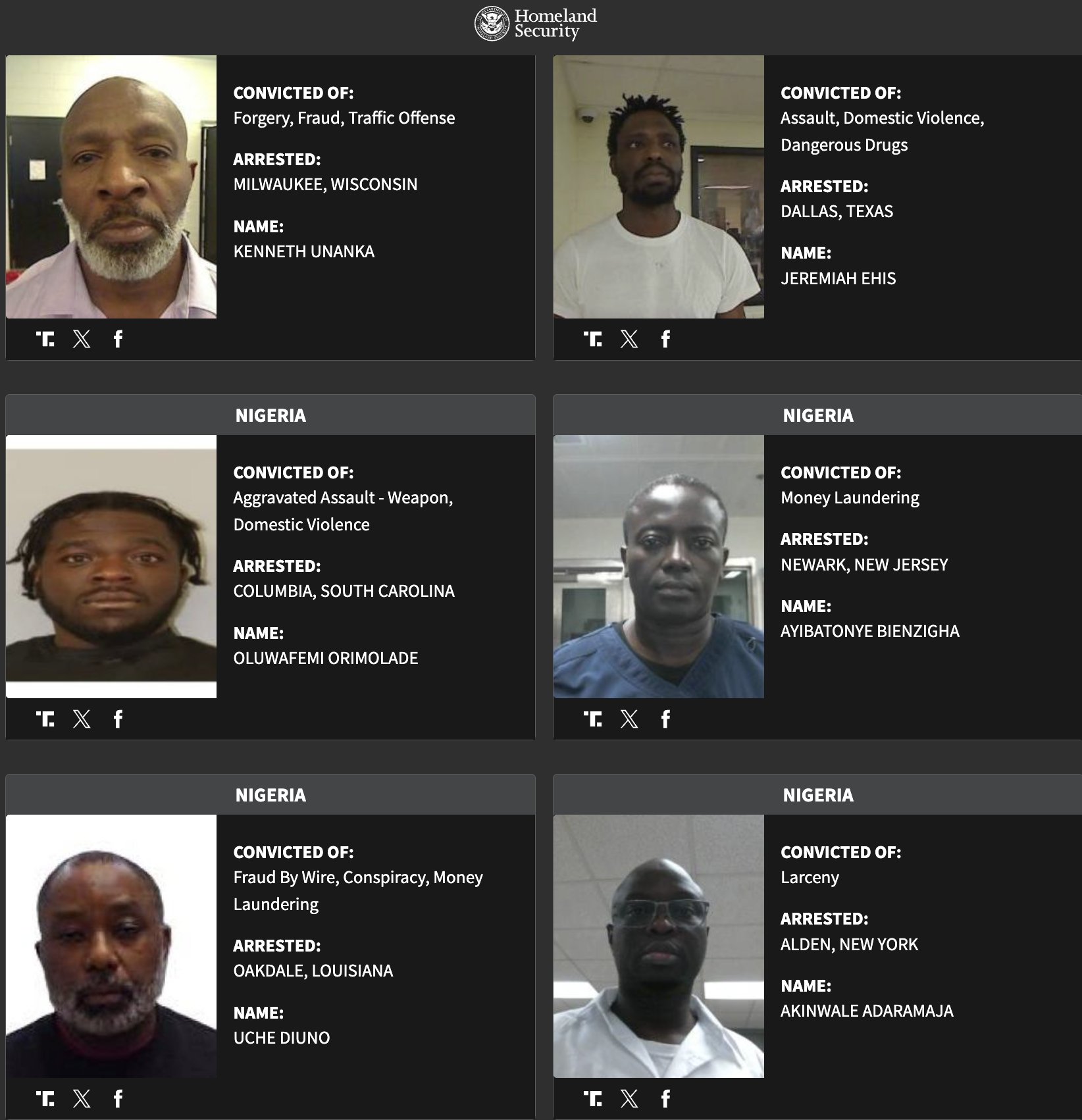 The US department of homeland security (DHS) has arrested 79 Nigerians described as among the “worst of the worst” criminal offenders.