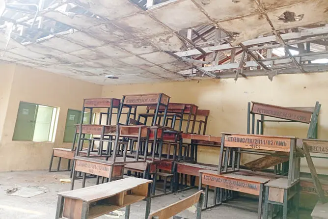 A survey of the premises by our reporter revealed that the roofs of four blocks (containing three classrooms each) have been completely blown off, and the ceilings have caved in.