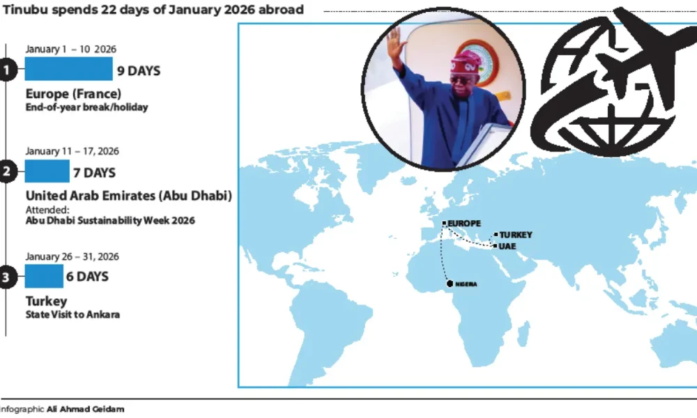 President Bola Ahmed Tinubu spent 22 days outside Nigeria in January 2026 alone, according to a review of his officially announced foreign trips. Within the period,...